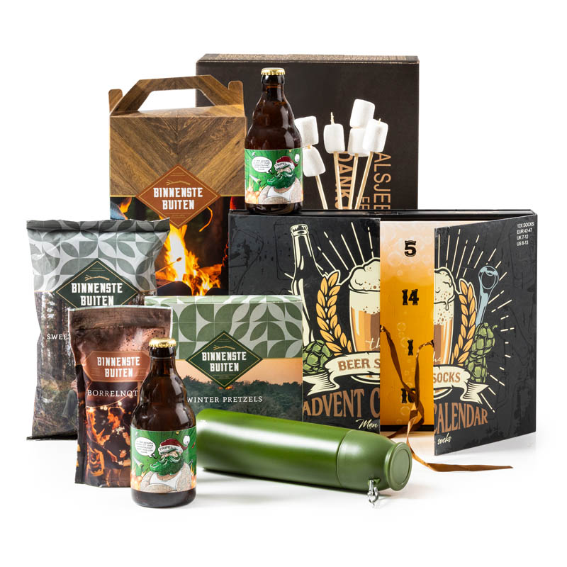 Voor de avonturier in hart en nieren! Dit outdoor-geïnspireerde kerstpakket zit vol winterse lekkernijen en een handige stoere thermosfles voor als je onderweg bent. Blijf je thuis? Geen probleem! De advent kalender met maar liefst 12 paar verschillende “bier” sokken is zeker een eyecatcher in dit toffe kerstpakket.