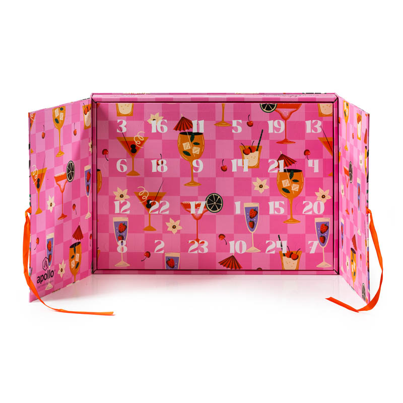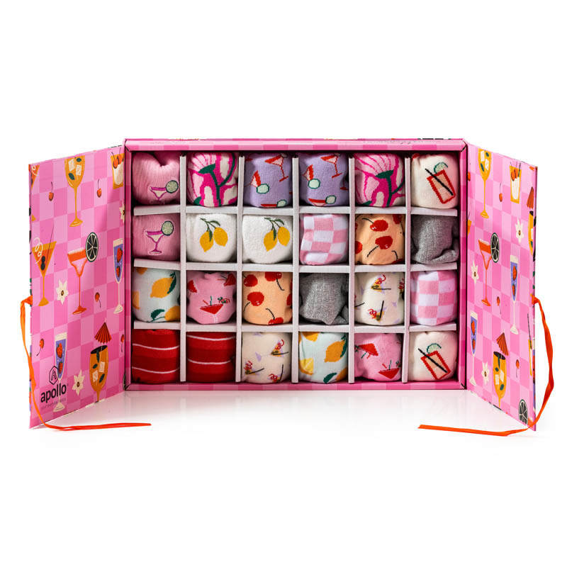 The Cocktail advent kalender, bevat 12 paar damessokken elk met een uniek cocktail-ontwerp, maat 36-41