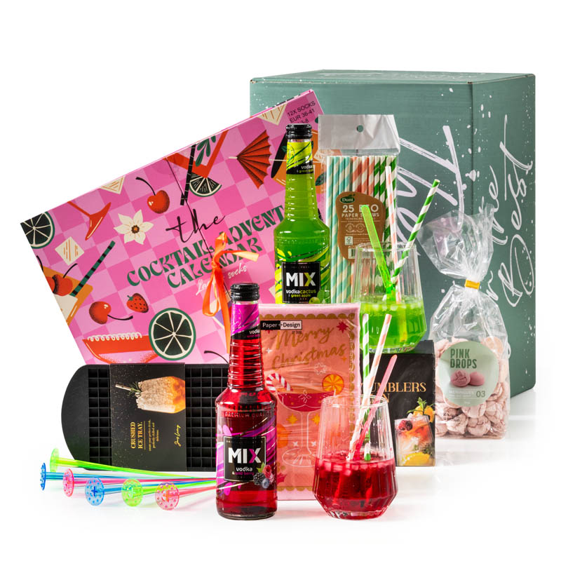 Laat je verrassen door dit originele kerstpakket met een knipoog. De Cocktail Advent Calendar met 12 paar damessokken (maat 36-41) zorgt elke dag voor een vrolijke twist, terwijl de stijlvolle tumblers en ijsblokjesvorm de perfecte basis bieden voor zelfgemaakte cocktails. Met de 8-delige cocktailstamper set en kleurrijke bio-rietjes mix je je favoriete drankjes, zoals de frisse Cactus Vodka & Green Apple of de Vodka & Wild Berry. De feestelijke servetten en roze meringue maken het geheel tot een feestje. P.s.: Je hoeft niet te wachten tot de advent hoor, je mag gewoon na ontvangst beginnen met uitpakken. Veel te leuk om dit te laten zitten!