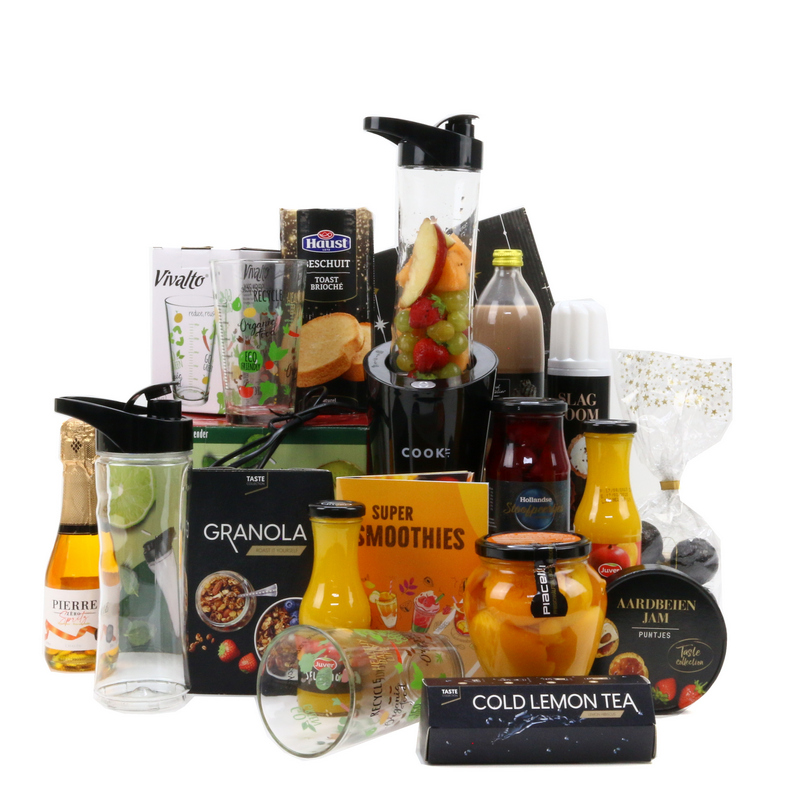 Een kerstpakket met power! Met de handige blender als middelpunt, verse sapjes, granola, glazen, slagroom en zelfs een flesje bubbels, 0.0% straalt dit kerstpakket vitaliteit, luxe én gemak uit. Maak je eigen smoothies en giet ze in de bijpassende glazen, maak je ontbijt en begin het jaar gezond!